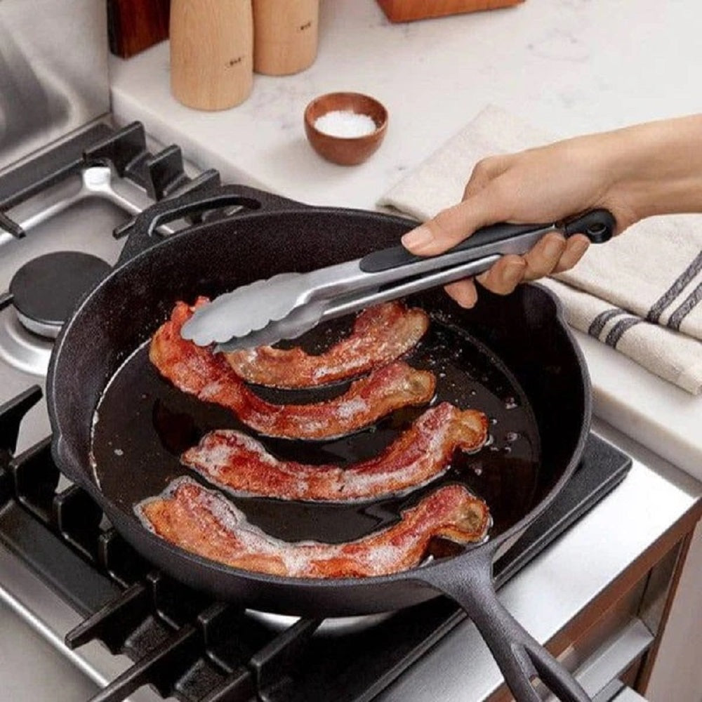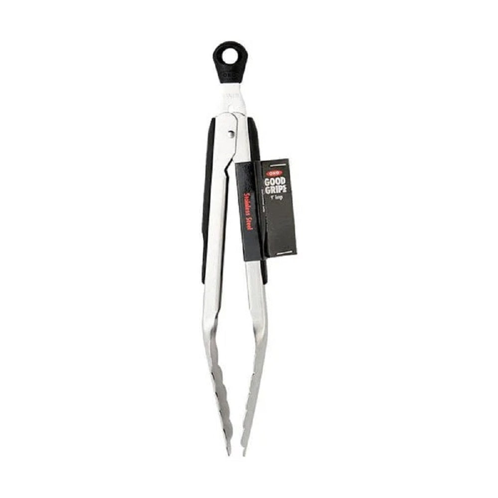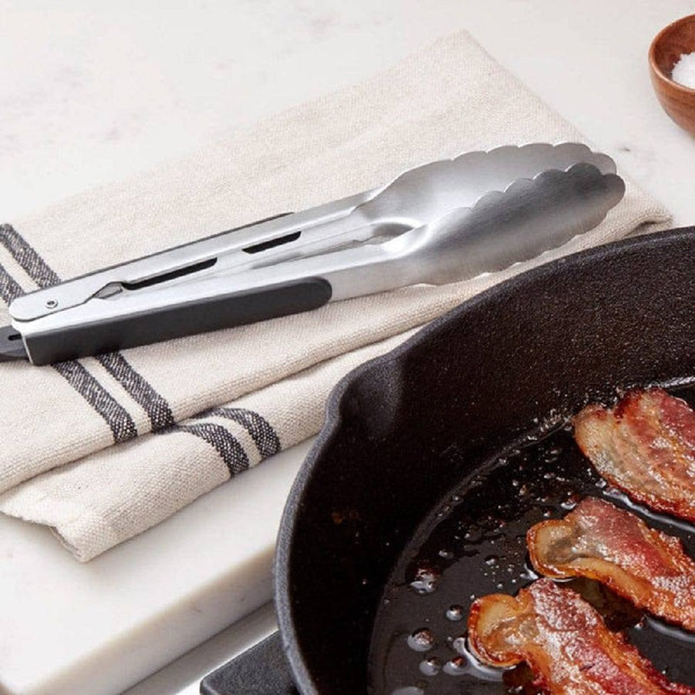 Our tongs feature brushed stainless steel with soft, non-slip handles and comfortable thumb rests. Easily lock in the closed position for convenient storage. The large pull-tab for locking also doubles as a hole for hanging. Also available in 12-inch and 16-inch sizes.