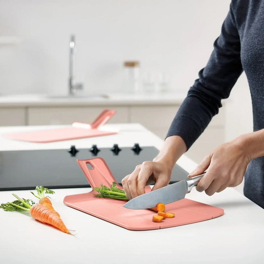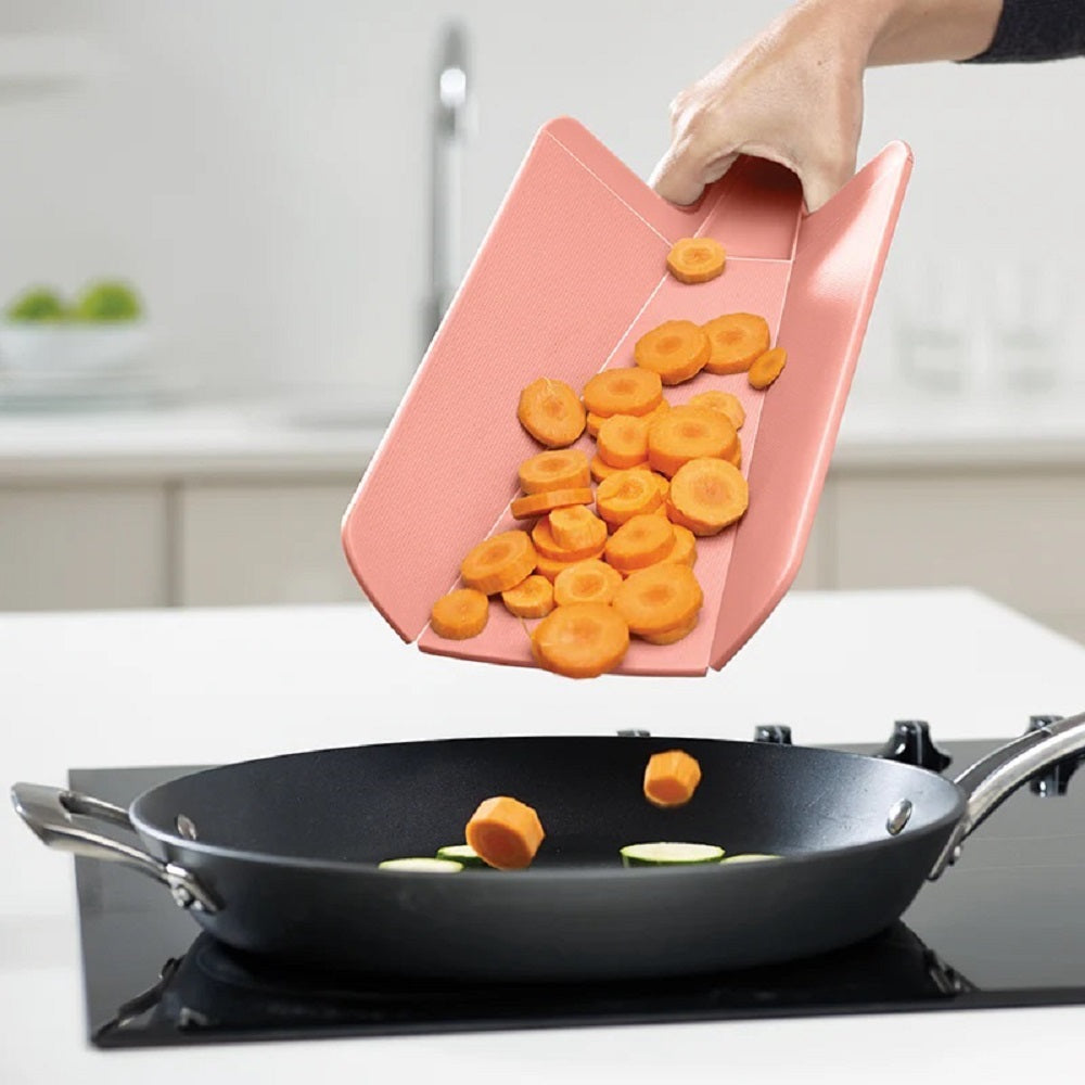 The original folding cutting board. Innovative folding design for easy food transfer. Textured, knife-friendly cutting surface. Soft-grip handle and non-slip feet. Cutting area: 10 x 8inches; Dishwasher safe
