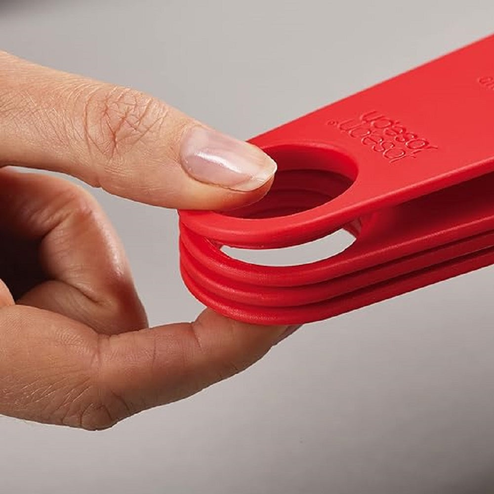 Available in a bold red colourway, this set of measuring cups from Joseph Joseph features a neat, space-saving design whereby the cups fit inside one another and the handles clip together, allowing for easy storage. In a set of four the measuring cups included are 1 cup (250 ml), 1/2 cup (125 ml), 1/3 cup (85 ml) and 1/4 cup (60 ml).