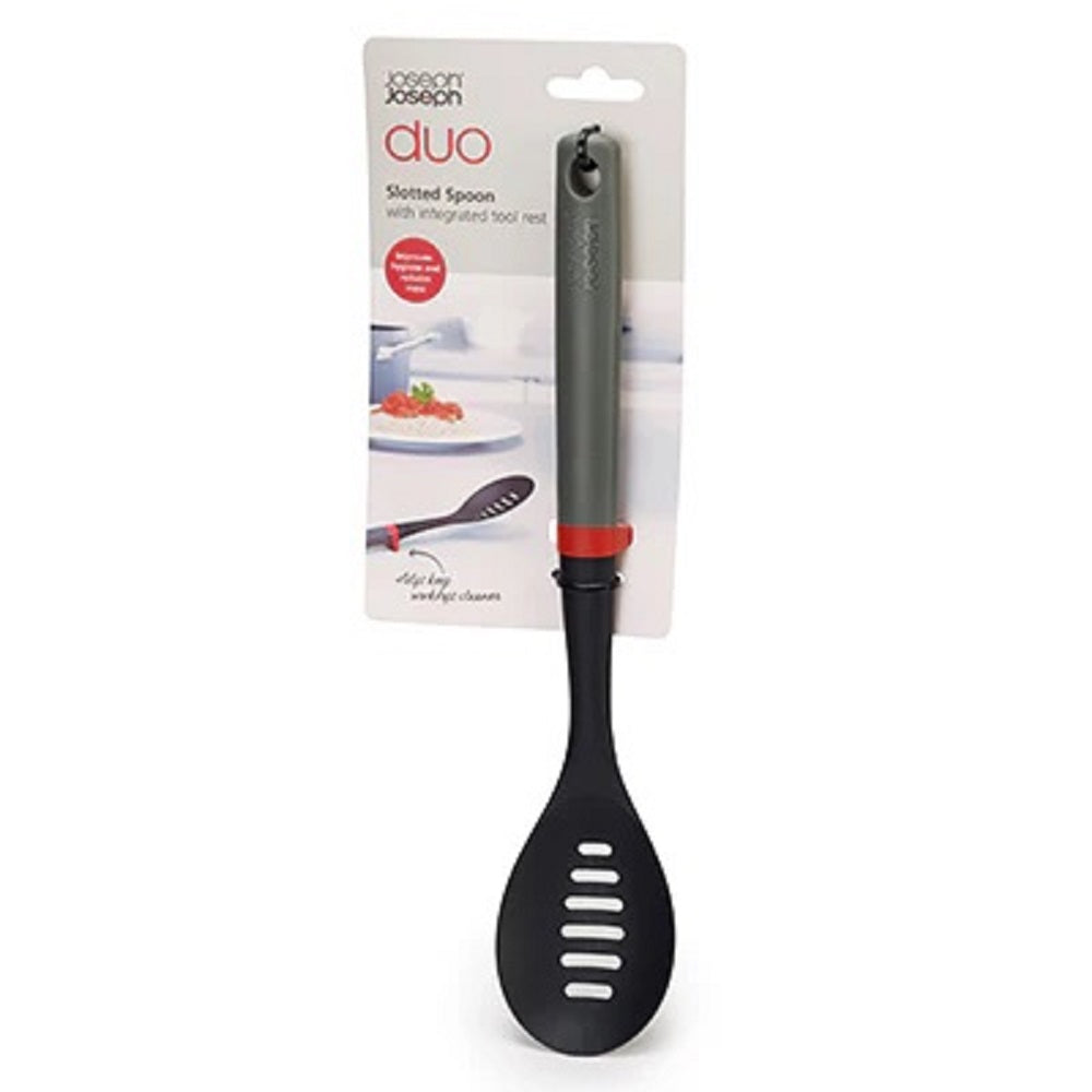Ideal for use with your non-stick cookware due to its non-scratch properties, this slotted spoon from Joseph Joseph has a head crafted from glass-filled nylon making it heat resistant up to 200C/392F. Designed with an integrated rest on the handle, this spoon will help improve hygiene and reduce mess.