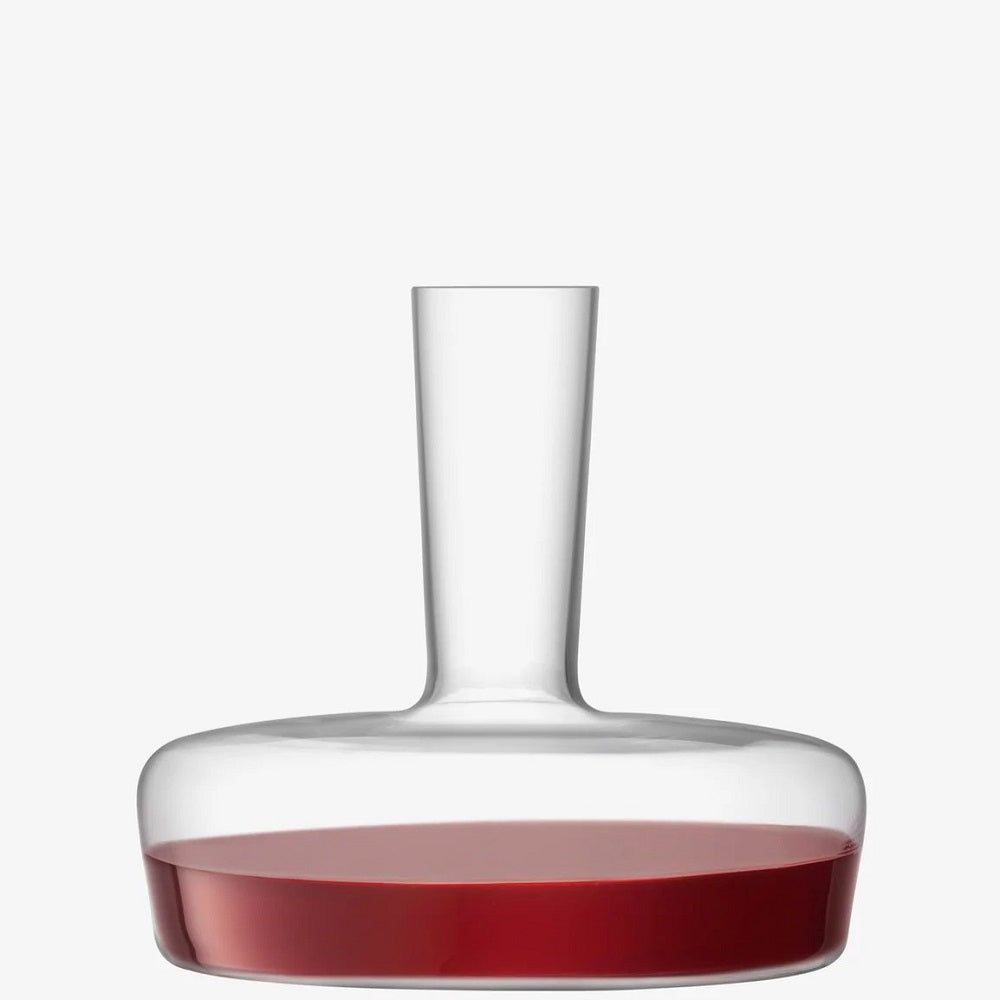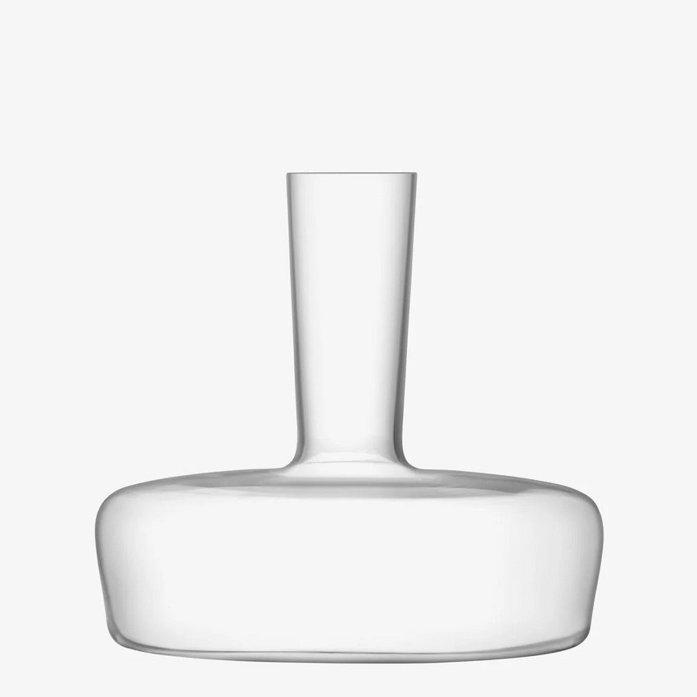 A contemporary mouth-blown wine carafe with an angular profile, tapered neck and flat, polished rim. Contemporary shape Flat, polished rim Mouth-blown glass
