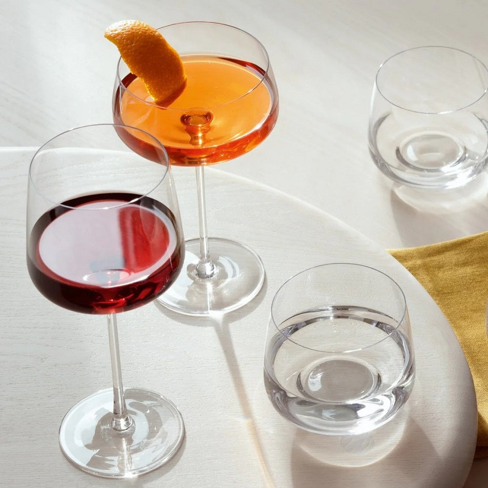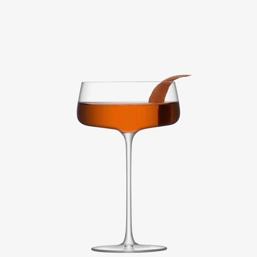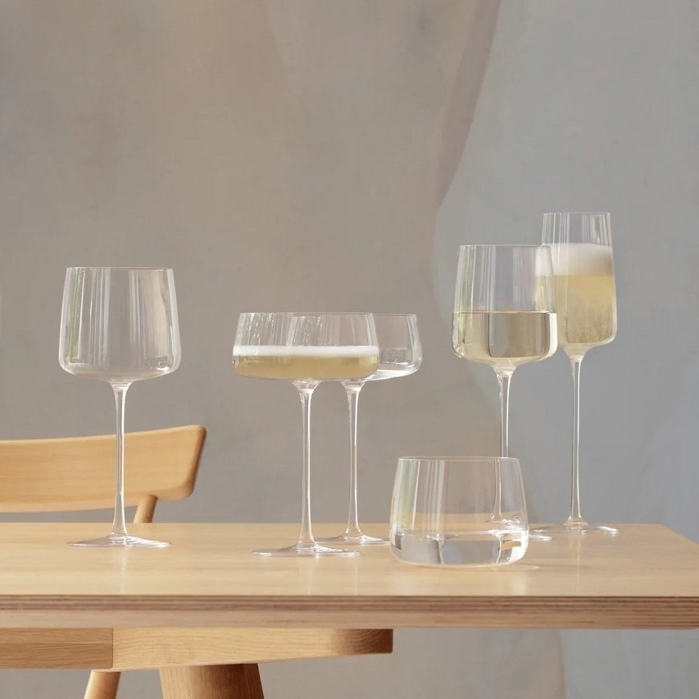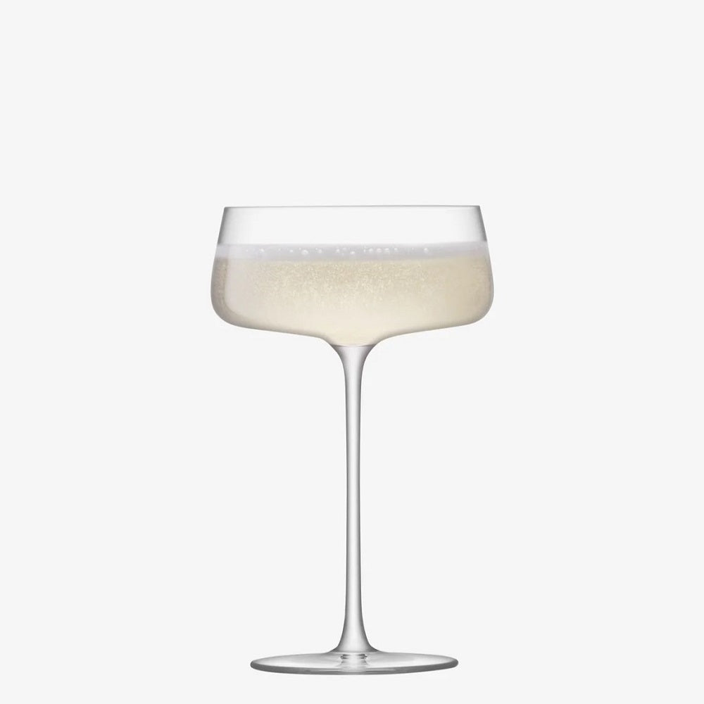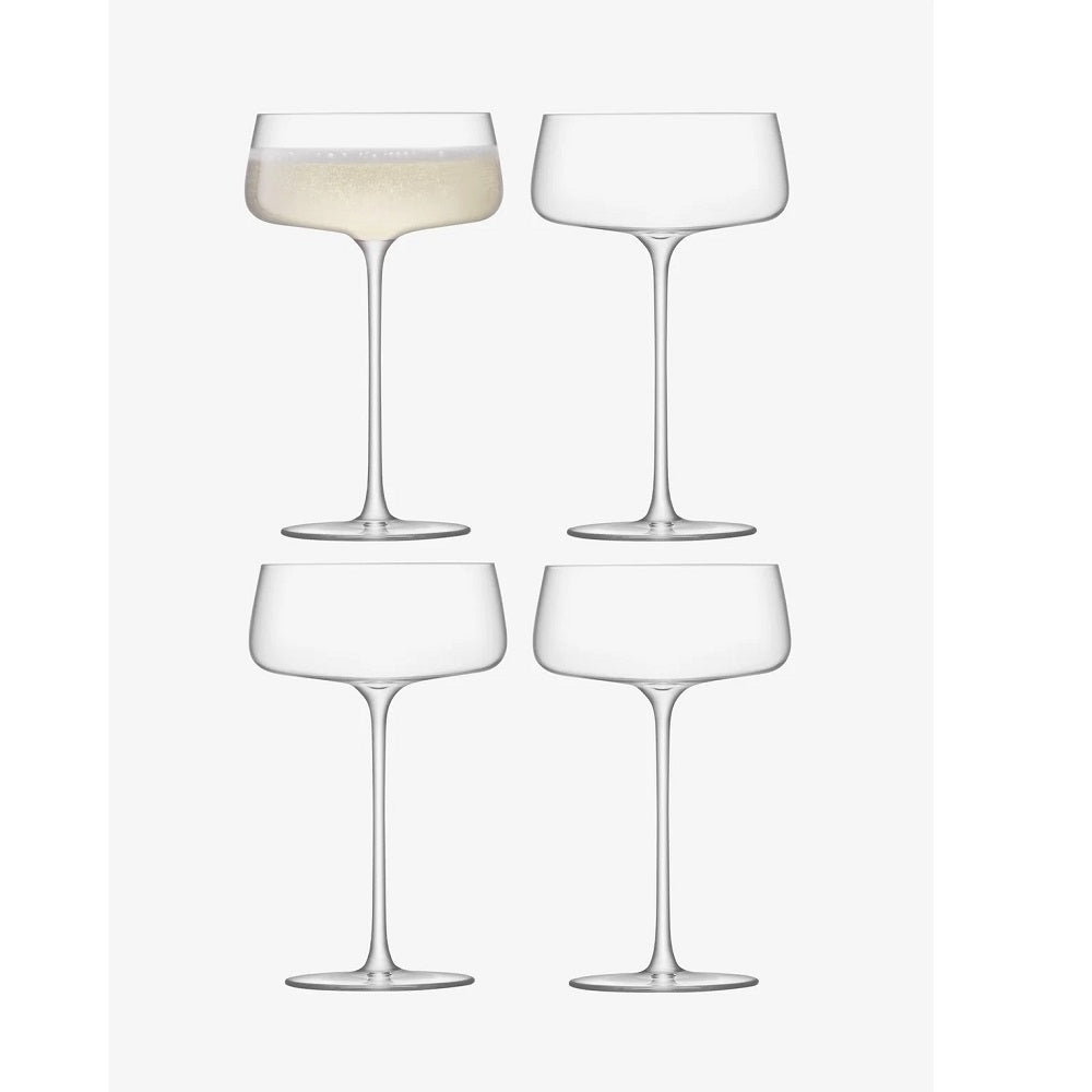 Set of four contemporary coupe glasses with tall, elegant stems. The generous angular bowl tapers towards a fine rim. Made from lead-free crystalline glass for clarity and strength. Contemporary shape Tall stems Fine rims  Dishwasher safe