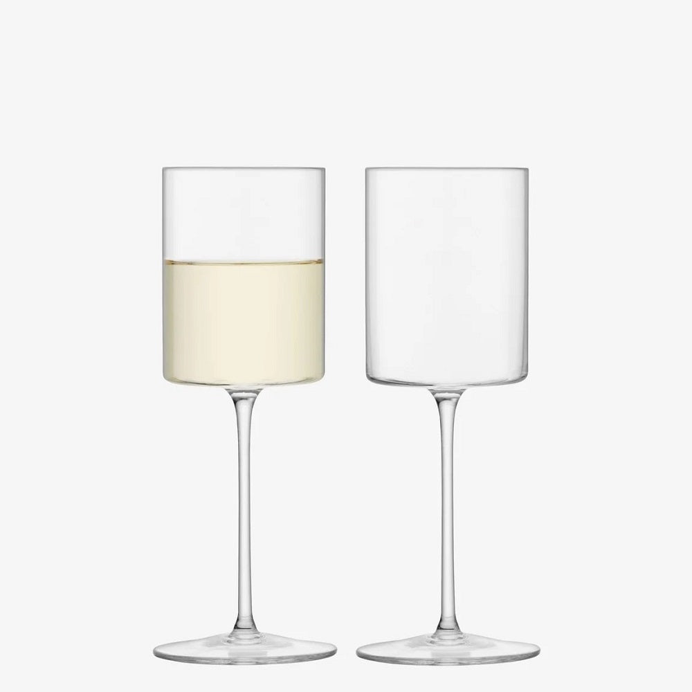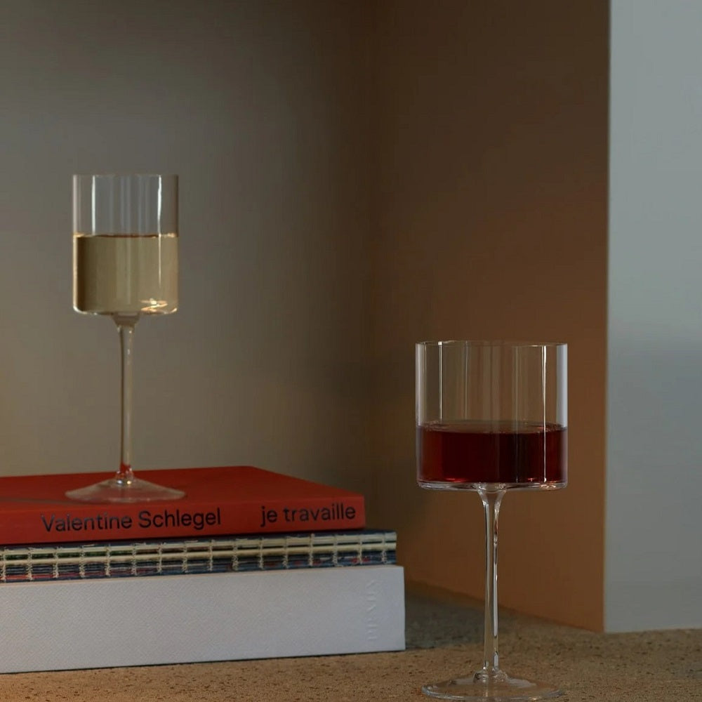 A set of two of mouth-blown wine glasses with cylindrical bowls and an angular, geometric profile. Mouth-blown glass Cylindrical bowls with flat bases Hand-drawn stems