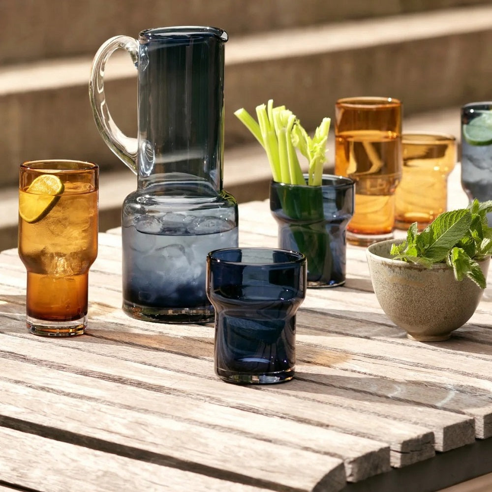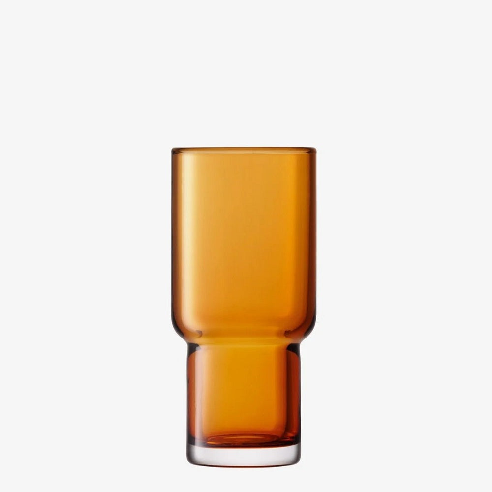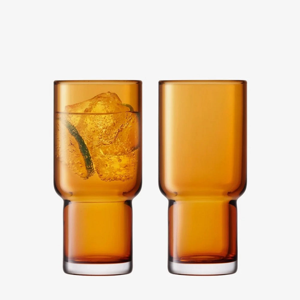A set of two mouth-blown glass highballs with thick, stepped walls. Available in clear and cased-cultured glass. Mouth-blown glass Stepped shape Available in clear or cultured glass