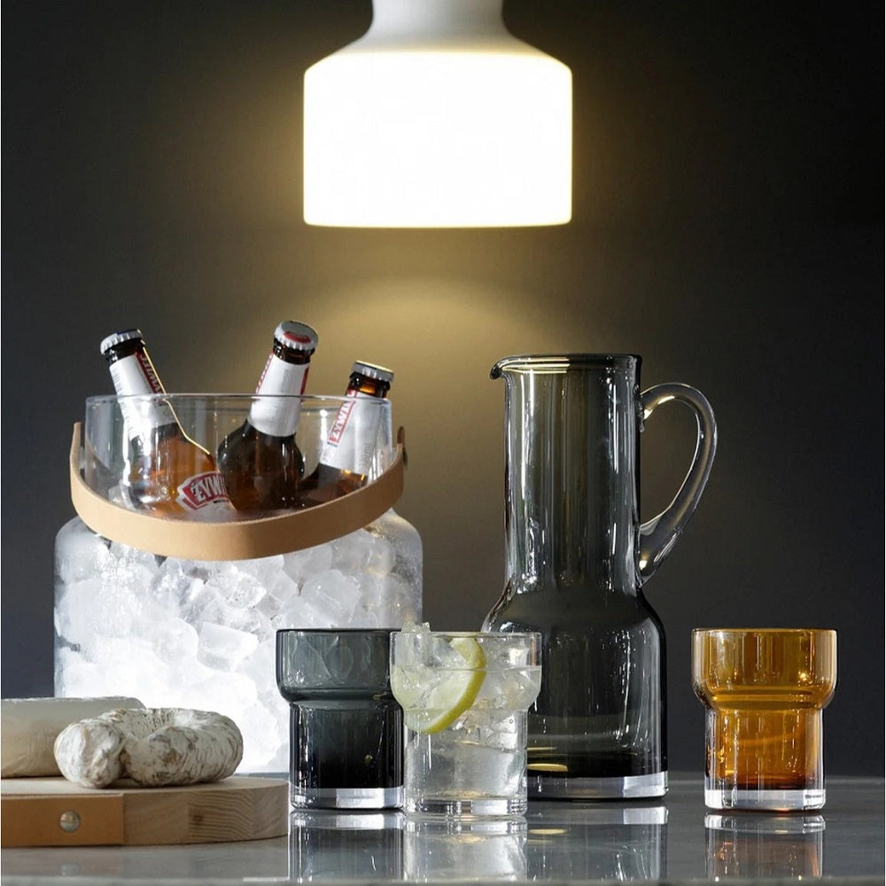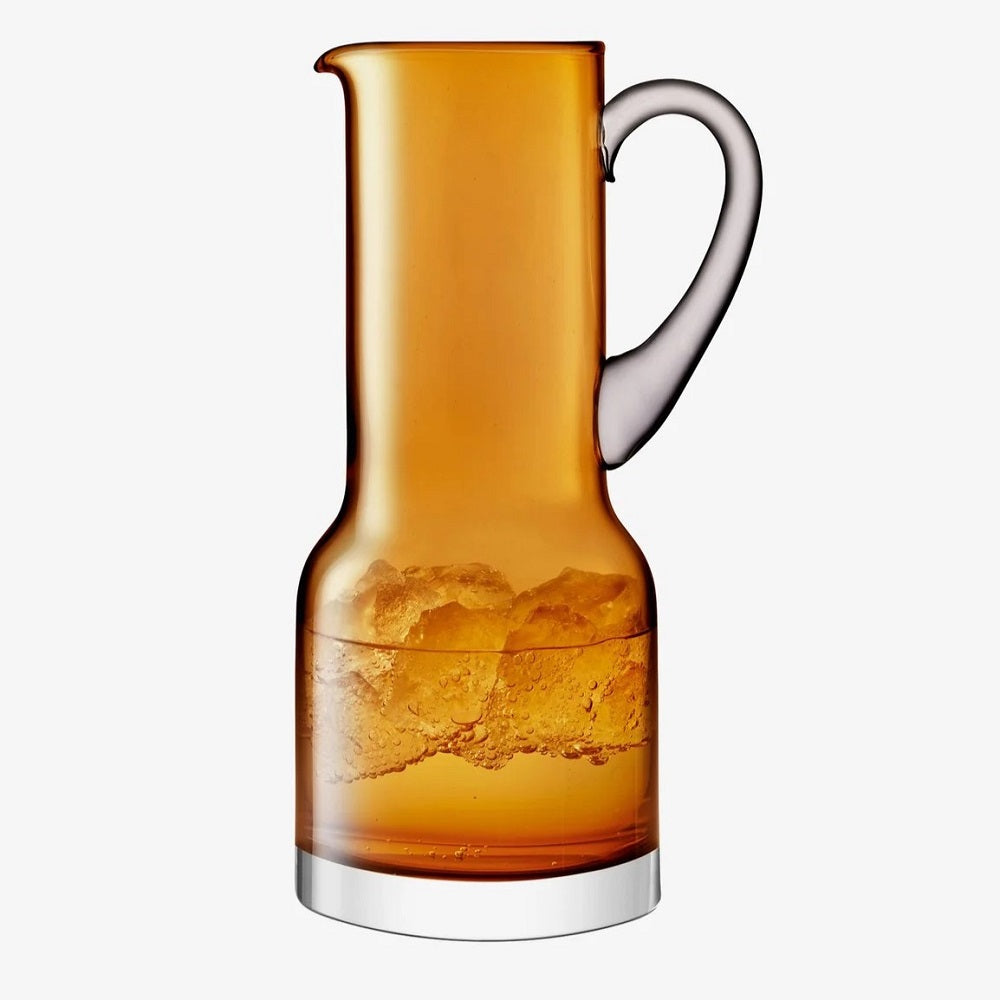 A mouth-blown jug with thick, stepped walls and clear glass handle. Available in clear and cased-coloured glass. Mouth-blown glass Stepped shape Available in clear or coloured glass