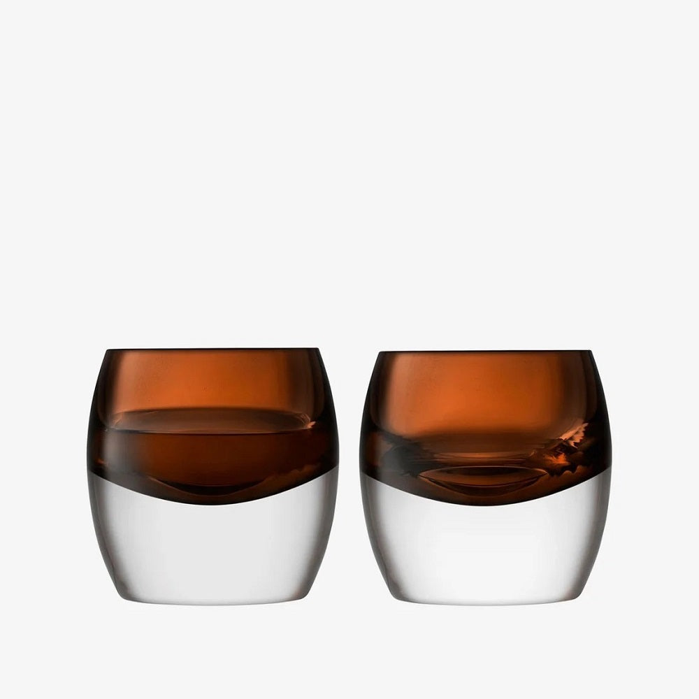 A pair of modern, curved whisky tumblers. Expert craftsmanship is required to case the brown glass within a layer of clear and create each tumbler's weighty base. Mouth-blown cased-cultured glass , Heavy bases