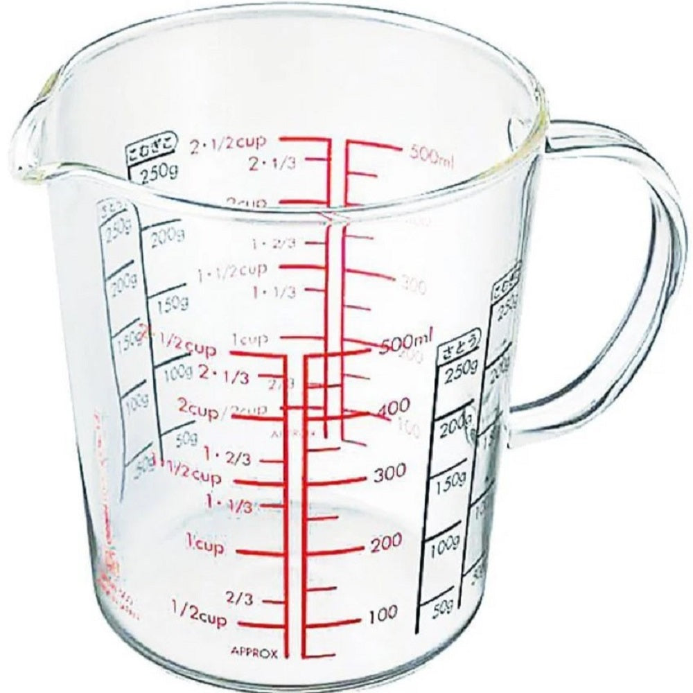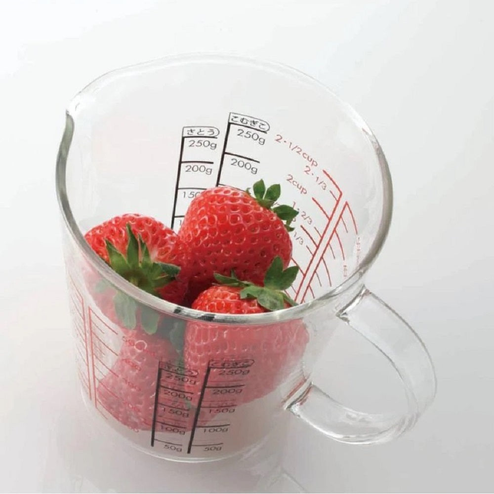 Considering the line of sight when using a measuring cup, we used markings that is clearly legible when viewed from atop. This has measurement markings not just for fluids, but for sugar and flour as well. Being heat resistant, it can be used when preparing with hot water or heating it in a microwave
