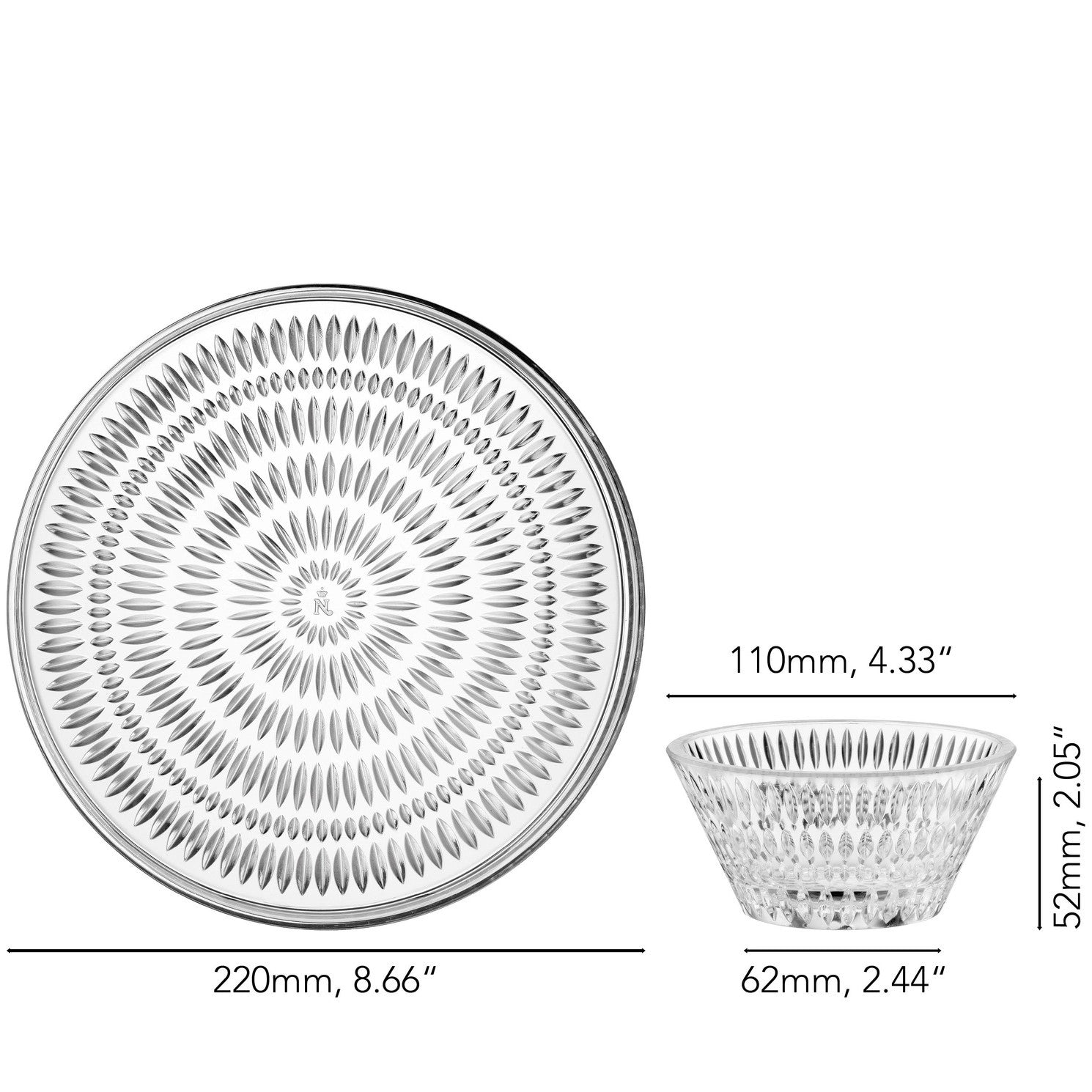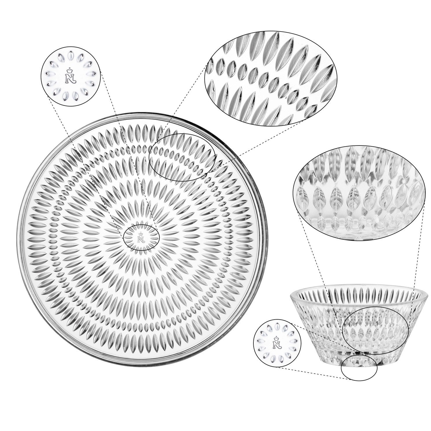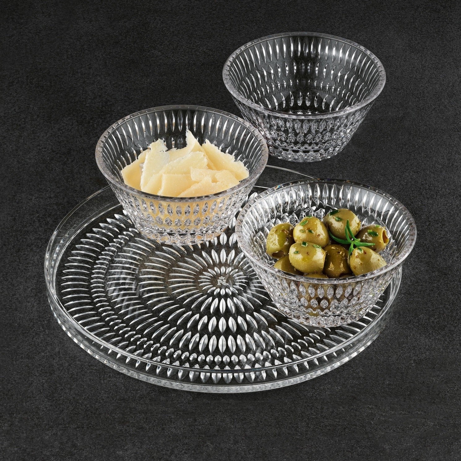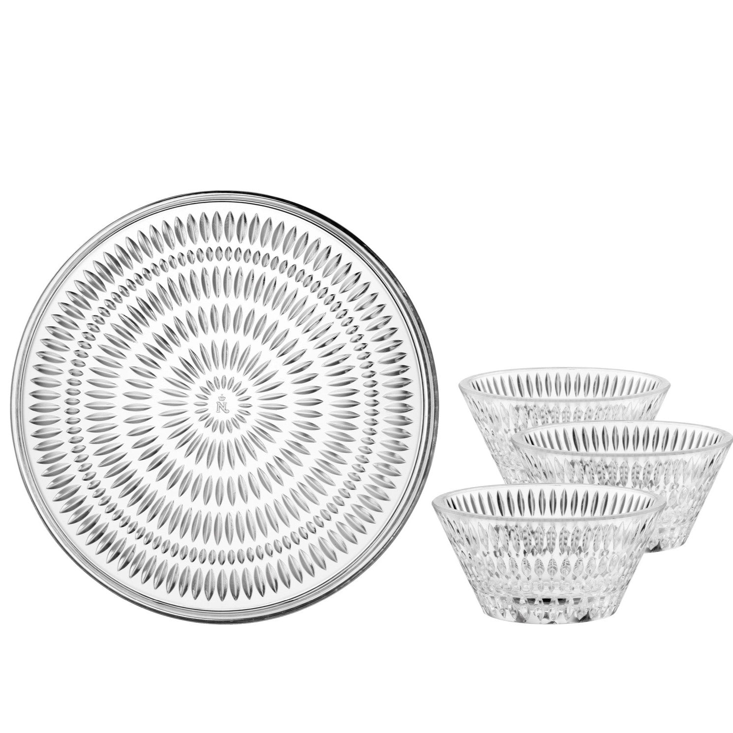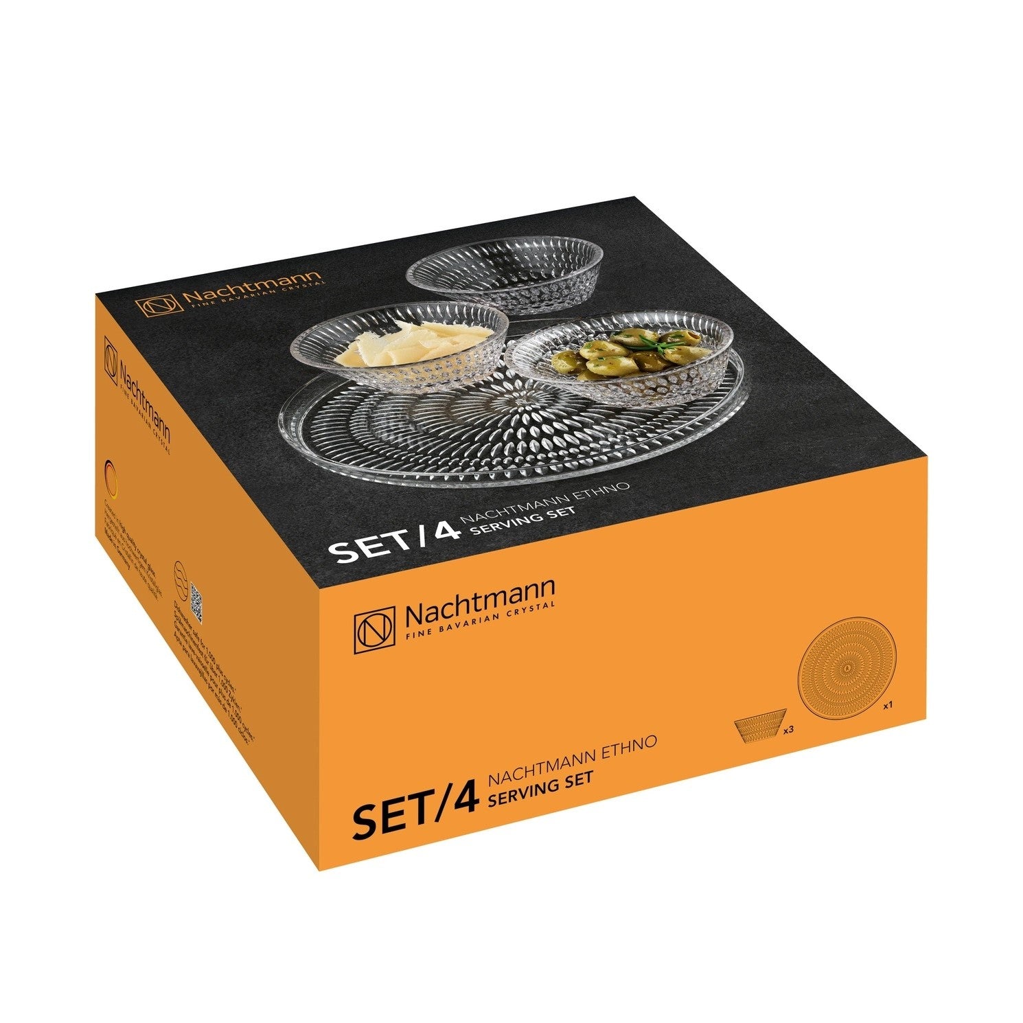 The elegant serving set consists of a plate with space for three small bowls. The bowls are perfect for serving antipasti, starters, snacks and dips. All items are made of high-quality crystal glass. Their sophisticated design makes them a special eye-catcher for any occasion. Impress your guests with this versatile and stylish serving set, which is ideal for any culinary creation! This product is made of clear crystal glass. The NACHTMANN Ethno glassware series takes its unique personality from its distinctive, harmonious pattern of close-packed notched elements. Their facets create a sparkling play of light, particularly in evening settings. Combining multicultural flair with easy-going lightness.