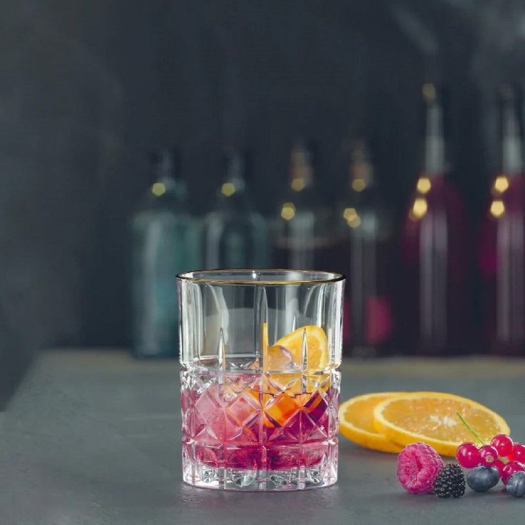 The Nachtmann HIGHLAND GOLD whiskey glasses invite you to enjoy fine drinks and cocktails. The opulent cut design of the crystal glasses is finished with a golden rim. Whether for festive occasions or in daily use, the HIGHLAND glasses bring a bar feeling into every house and always set a particularly luxurious accent.