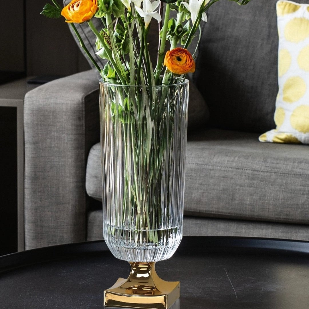 The vase acts as a striking focal point for elaborate interior styling. Whether placed on a grand banquet table or gracing the intimate setting of a soirée, this centrepiece vase embodies elegance and timeless beauty, enhancing the surroundings with its captivating presence. The Gold Footed Vase features a precious metal base in dazzling gold as a sparkling accent. The base has a real precious metal alloy applied by hand and then covered with a varnish for a long-lasting finish that won't tarnish. The result is a highly luxurious focal point for elaborate interior styling. Tall and impressive, Minerva crystal vases from NACHTMANN stand proud as a stunning decorative centrepiece. The classic design of the Minerva vases will charm any space with its regal elegance, and the heavy base offers the stability and space to accommodate generous floral arrangements.