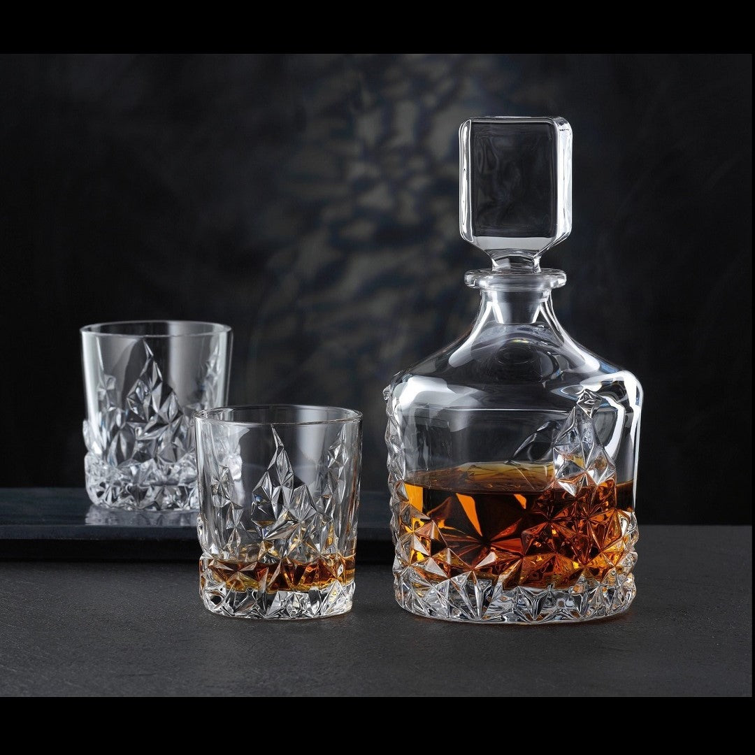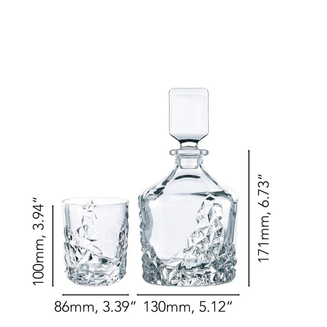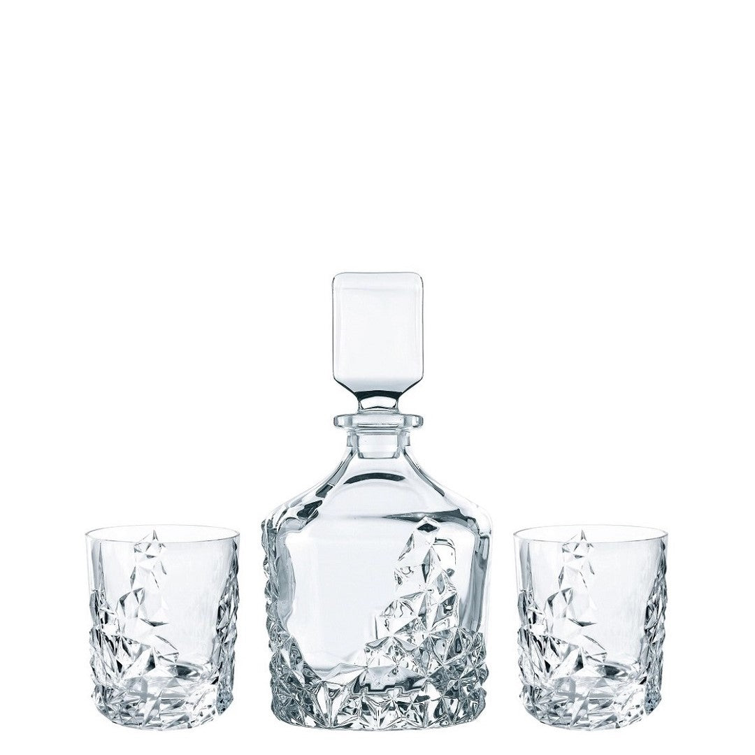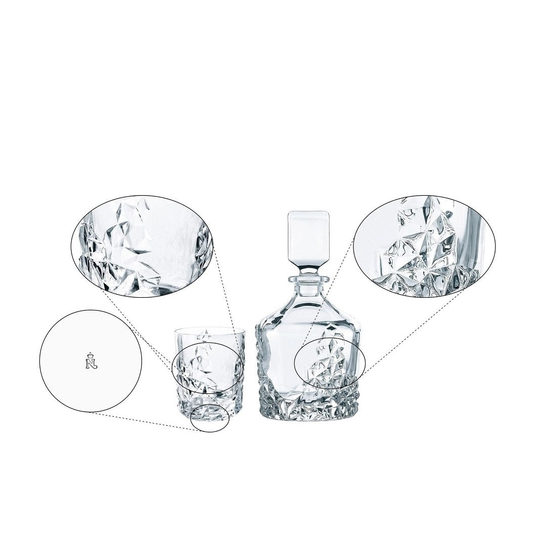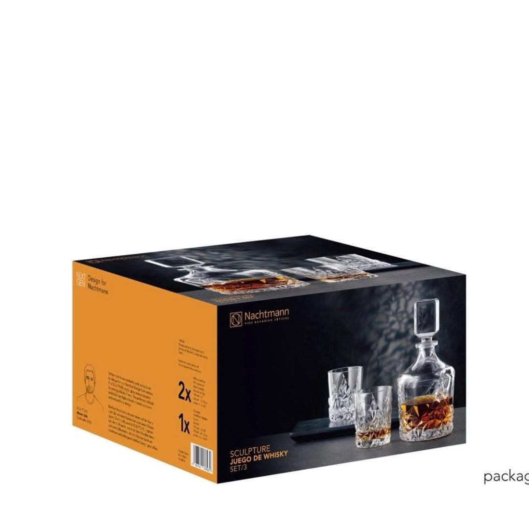 The Whisky Set includes 2 Whisky tumblers and a matching Whisky decanter with a captivating profile. Unique and eye-catching, this set makes the perfect gift for a whisky lover looking to take their favorite spirit to the next level. The Sculpture series was developed in 2012 as part of the Nachtmann NextGen Project. Sculpture designer Ahmet Uslu came from the Konstfack University of Arts, Crafts and Design in Stockholm. The series turns solid rock into crystal, exploring light, reflections,, and refractions. In this design, the complex geometry of the decoration counters the brilliance of the clear crystal. This product is machine-made. Due to the manufacturing process small tolerances in the measurements are possible. This item is dishwasher safe