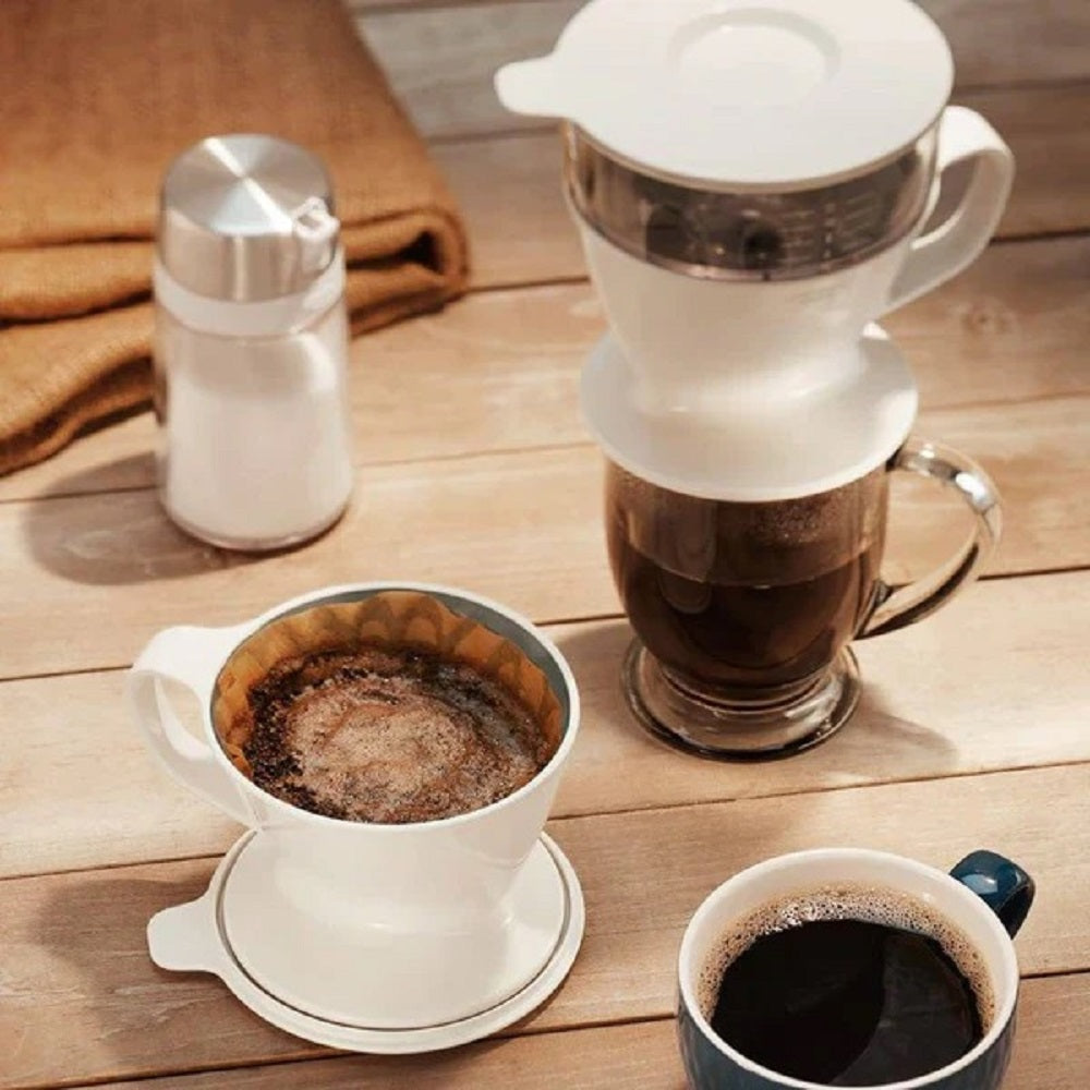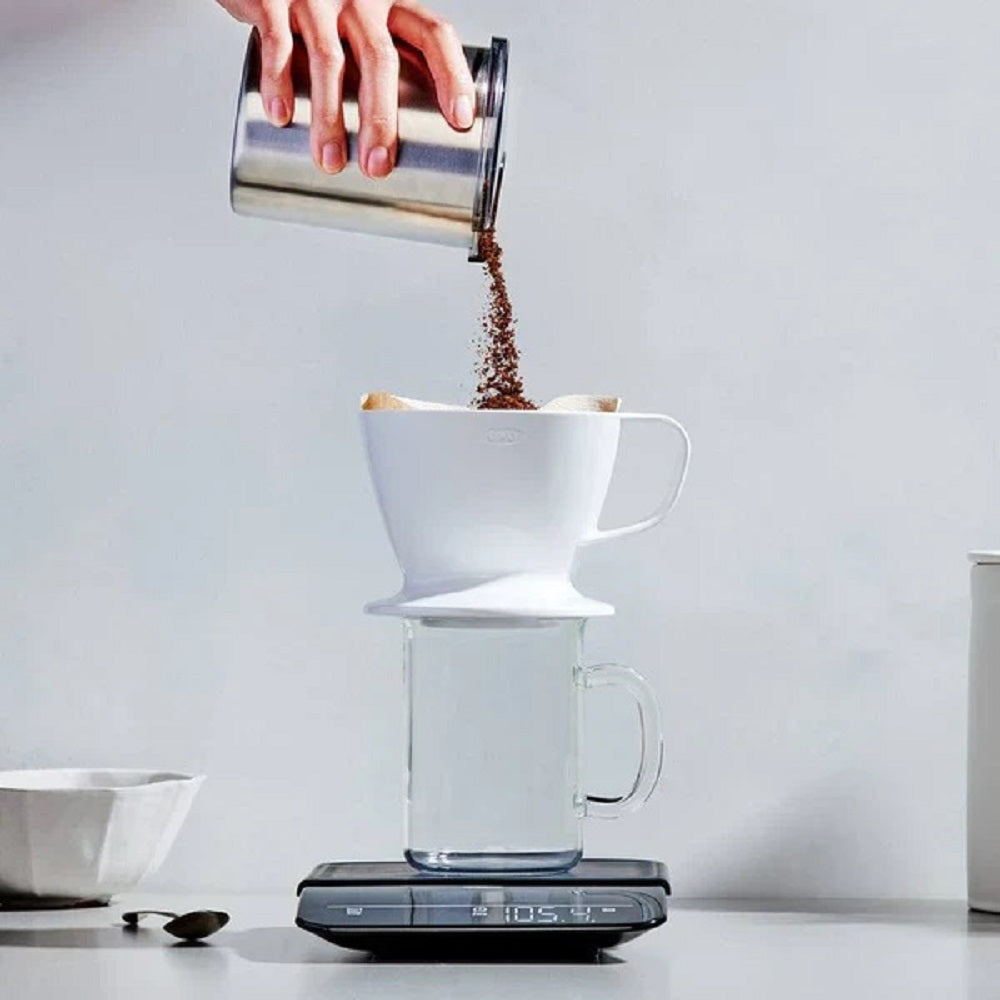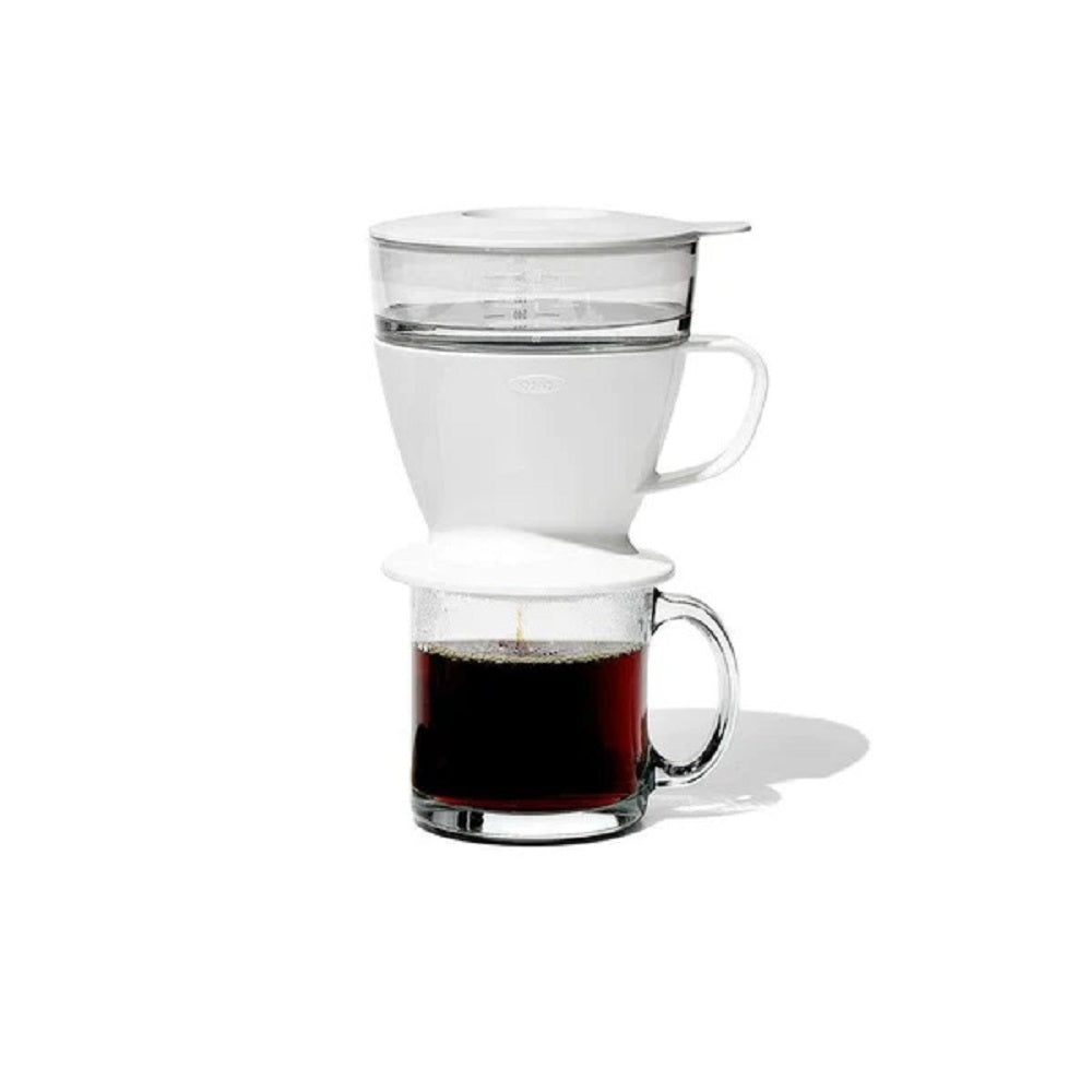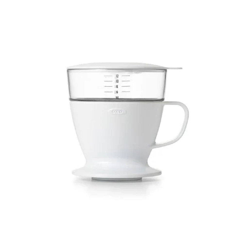 The OXO Brew Pour-Over Coffee Dripper with Water Tank is an innovative, fuss-free way to brew pour-over coffee at home. Just add grinds, pour in hot water, and the Pour-Over Coffee Maker will take it from there. The water tank features a precise hole pattern that automatically distributes hot water evenly over coffee grounds at just the right rate to maximize flavor. Easy-to-read measurement markings show you how much water to add -- up to 12 ounces. The snug-fitting lid retains heat as the coffee brews and doubles as a drip tray once you are done. Includes ten OXO Unbleached All-Natural #2 Cone Coffee Filters.