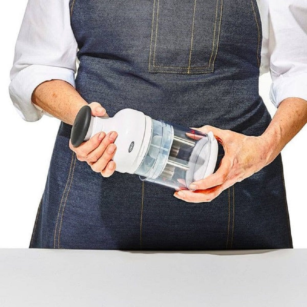 Need to chop up onions, celery, and carrots for a quick mirepoix? How about some tomatoes and cilantro for a salsa Or nuts for a batch of brownies? The OXO Good Grips Chopper can handle all these tasks much faster than your chef's knife. (It's safer, too.) It features a sharp, stainless steel blade that rotates with every single press of the knob, resulting in perfectly even pieces. Load it up and then just press the knob to start chopping. It's comfortable and easy to use, and the large catcher cup has convenient measurement markings. Of course, the whole thing comes apart for cleanup. Dishwasher safe. Features Chop veggies, herbs, nuts, and more into uniform pieces. Sharp, stainless steel blade rotates as you pump the handle. Comfortable knob designed for minimal effort on your part. Catcher cup features convenient measurement markings. Great for salads, salsas, stir fries, sauces, and more. Comes apart for cleaning, dishwasher safe