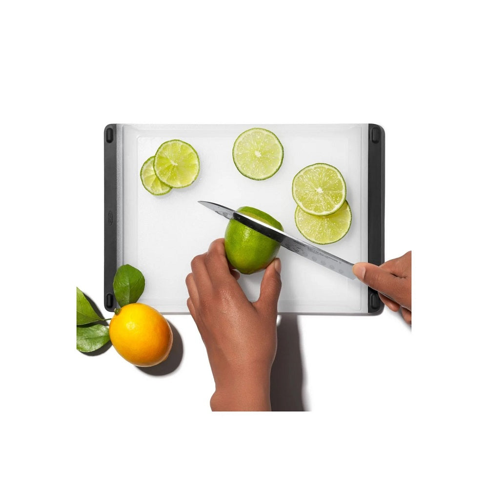 At 7.23-in x 10.75-in, the OXO Good Grips Prep Board is the perfect partner for paring fruits, trimming vegetables and more. Non-porous construction locks out odors for a fresh cutting surface that resists deep scratches and goes easy on your knives. This double-sided board has a solid side for produce and a grooved side for meat, plus a drip catcher with easy-pour corners to take care of liquid run-off. Soft, tapered edges double as a comfortable handle, while non-slip feet keep the board in place as you slice. Dishwasher safe.