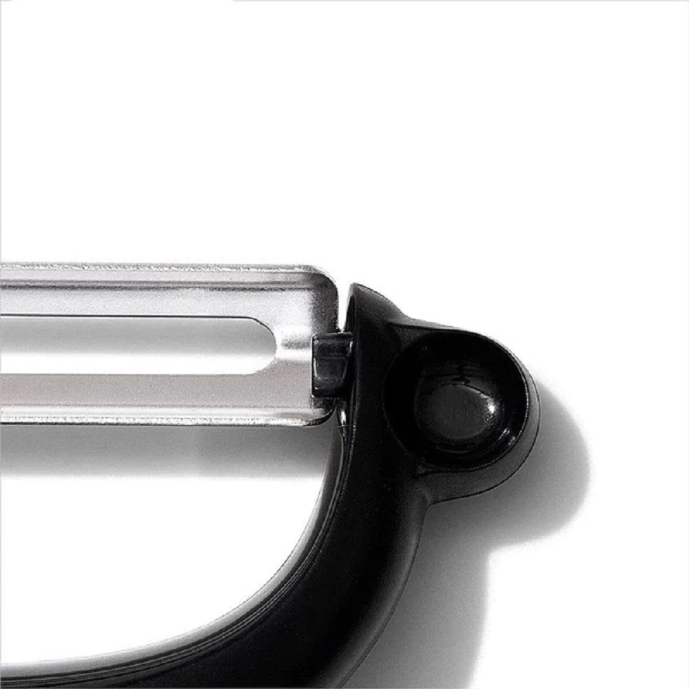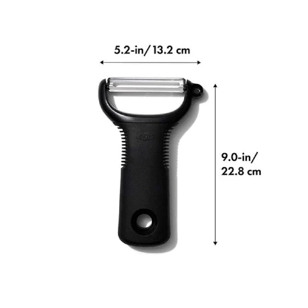 The OXO Good Grips Y Peeler is perfect for prepping tough-skinned fruits and vegetables. Two sharp, Japanese stainless steel blades flex to peel large areas with each stroke. The handle was designed for comfort during fast, repetitive use, whether you are right- or left-handed. The soft grip stays non-slip, even when wet. A durable, built-in potato eyer carves out blemishes without damaging your produce. The handle includes a hole for hanging storage. Rustproof and dishwasher safe