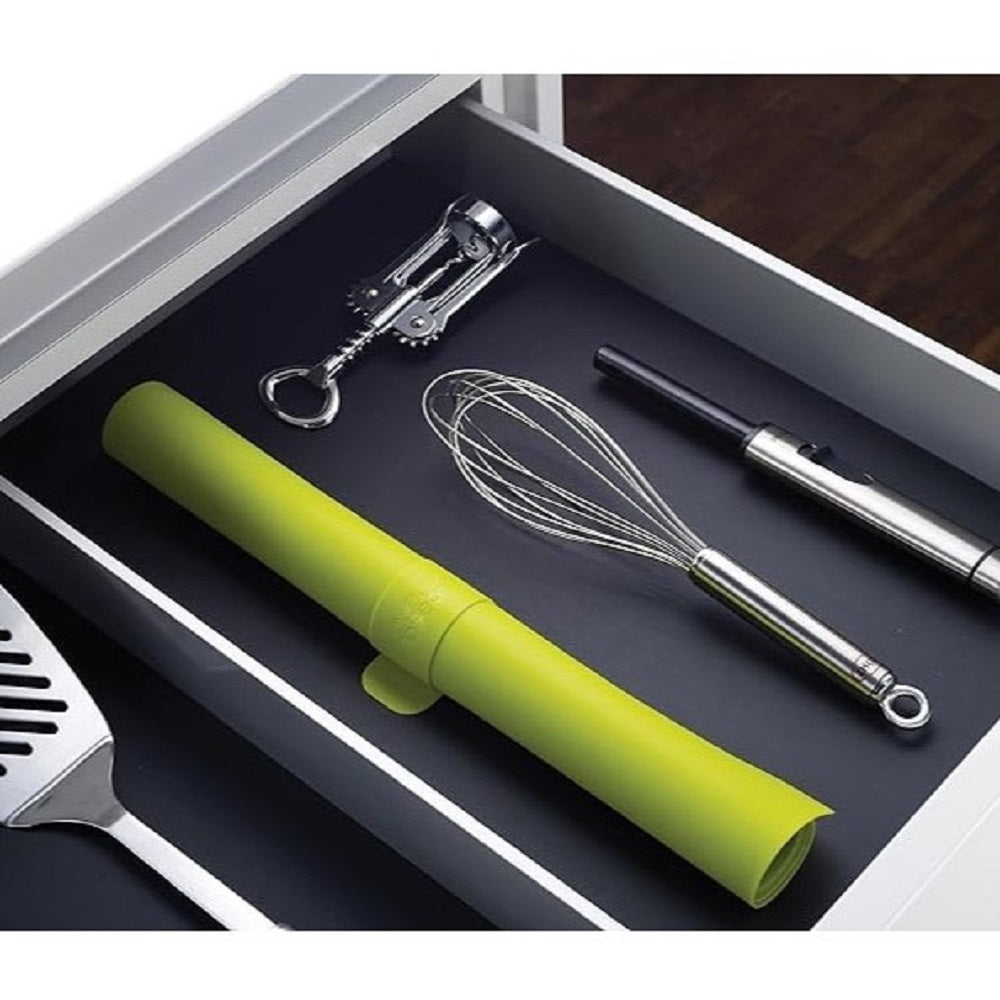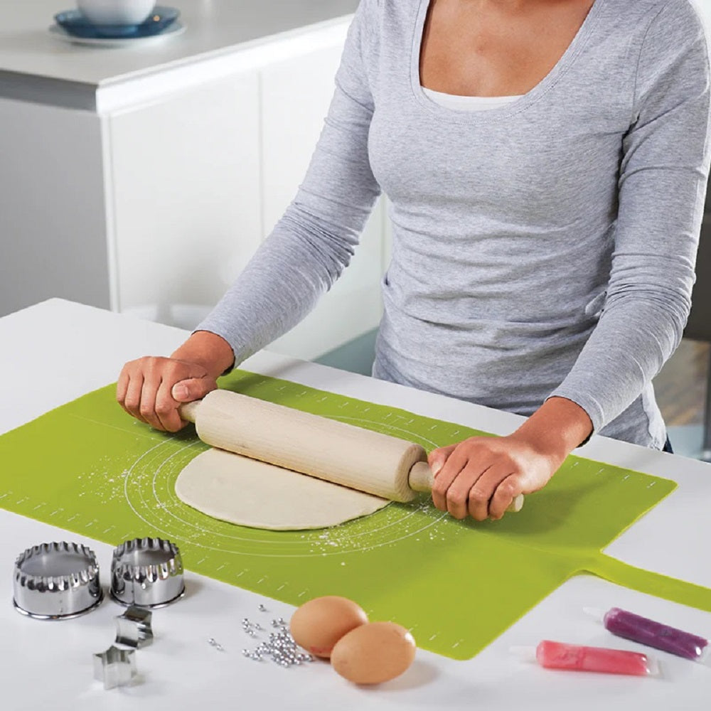 Hygienic, non-slip silicone surface for rolling pastry or icing. Integrated strap keeps mat rolled for convenient storage. Large rolling area: 74 37 cm Printed rolling size guide for preparing pastry on the mat itself, and go from 0 to 54 cm along one edge and 12.5 to 30 cm in diameter in the middle. Dishwasher safe