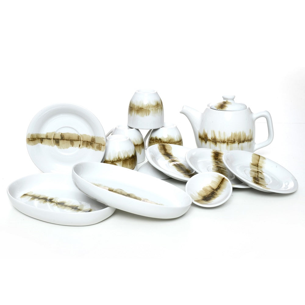 Enjoy moments of relaxation with our tea set in olive! This charismatic set features an 850 ml teapot and 180 ml cups, accompanied by tea saucers, snack plates, and dip bowls, all crafted from porcelain. It's the ultimate set for enjoying your favourite brew in style!