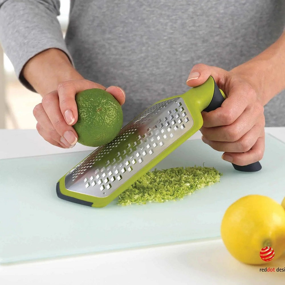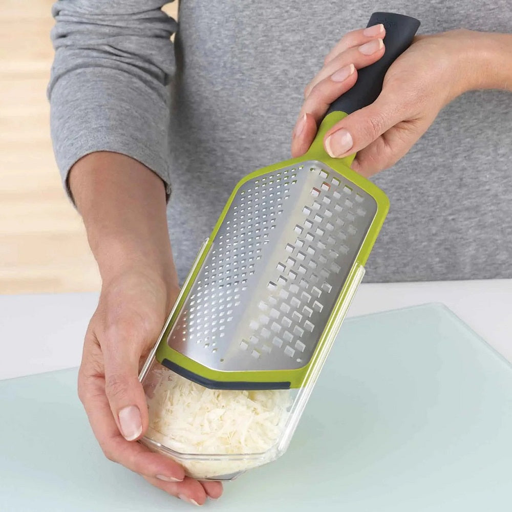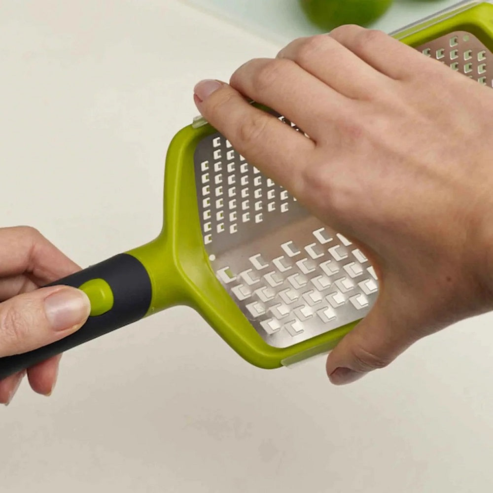 Two handle positions: Straight for grating straight over food or at 90? angle for extra support when granting a larger amount. Non-slip handle and feet. A reversible storage sheath can also be used to collect grated. Dishwasher safe