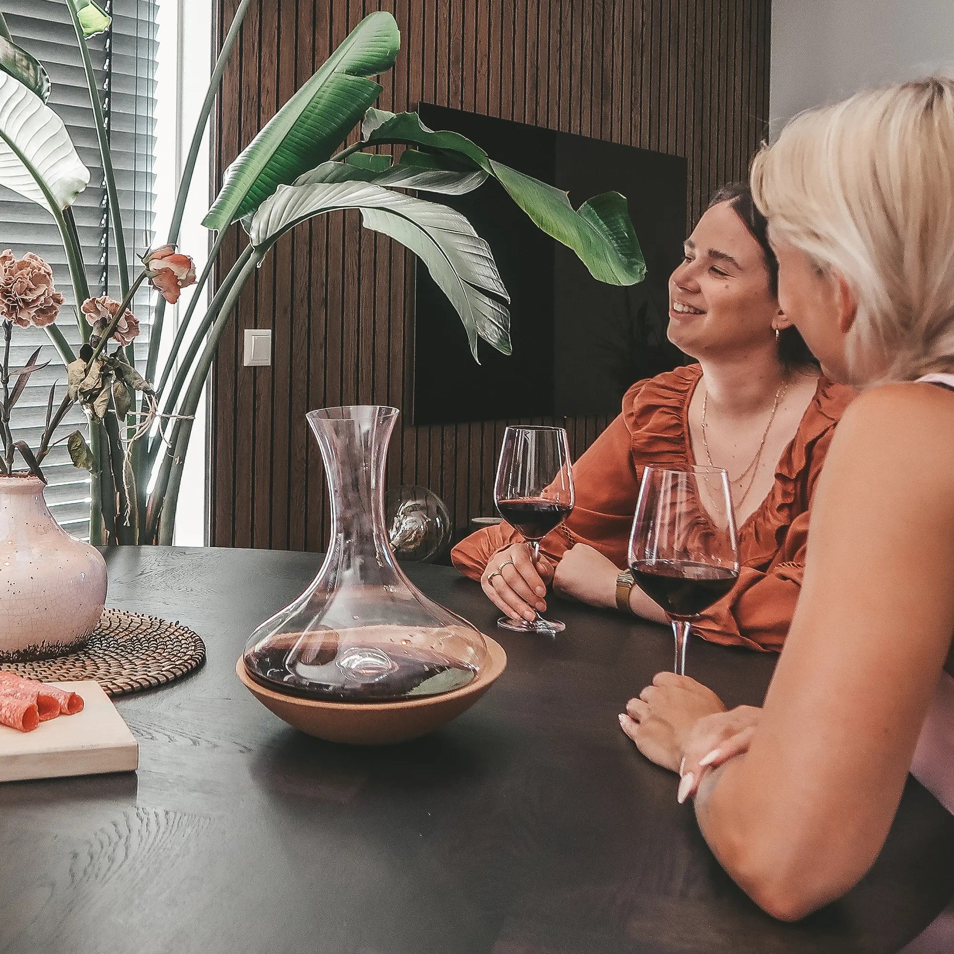 The Vacu Vin Swirling Carafe will be the centerpiece if your dinner table. The carafe spins to aerate your wine elegantly, releasing different aromas to improve the wine's body and flavor. Decant your wine by pouring it into the carafe. For young wines, you can pour the wine with a splash for extra aeration. Pour aged wine carefully to separate the wine from sediment in the bottle. Give the cork base a swing to swirl your wine through the decanter. Let the wine rest to breathe to enhance its flavours and aromas. Aerates your wine elegantly. By swirling, the flavour of the wine is enhanced It releases aromas by swirling. Separates your wine from sediments in the bottle. An eye-catching centerpiece for your dinner table. The carafe is made from premium crystal glass. The base is made from high-quality natural cork. The perfect gift idea for wine lovers