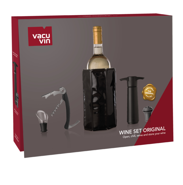 The Vacu Vin Wine Set Original contains 5 wine must-haves to open, serve, chill and preserve your wine. The gift box is assembled and packaged in our social production facility in the Netherlands. The set contains: Double Hinged Corkscrew Active Cooler Wine Wine Server Crystal The Original Wine Saver Vacuum Wine Stopper Double Hinged Corkscrew Lightweight 3-in-1 corkscrew Effortlessly opens wine bottles Active Cooler Wine Chills your wine in 15 minutes Keeps the bottle cool up to 90 minutes Store in the freezer to enjoy a cold class at any moment Wine Server Crystal Pours wine drip-free Suitable for all standard cork and screw top bottles Dishwasher safe The Original Wine Saver & Vacuum Wine Stopper Preserves your wine under vacuum up to 10 days Makes a click sound when optimum vacuum is reached Suitable for all standard cork and screw top bottles Wine Stoppers are dishwasher friendly